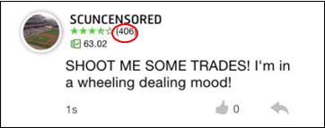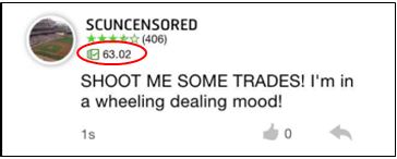 Description: This number represents the number of ratings that any trader has received since the start of 2014. Read that sentence very carefully, because it is NOT the number of completed trades the person has had. Ratings can be given for both offers and actual trade completions. The higher the count, the higher the amount of offers/trades that person has had.