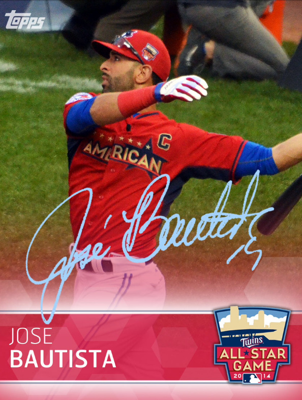 The reasoning behind the Jays getting another sig is that he was the top vote-getter for the ASG, which makes sense. The card looks great with the All Star logo, and I am so sad that Mauer didnt make it to the game to have a card like this made for him. Bats will be a coveted sig, regardless as 350 copies will be a big deal.
