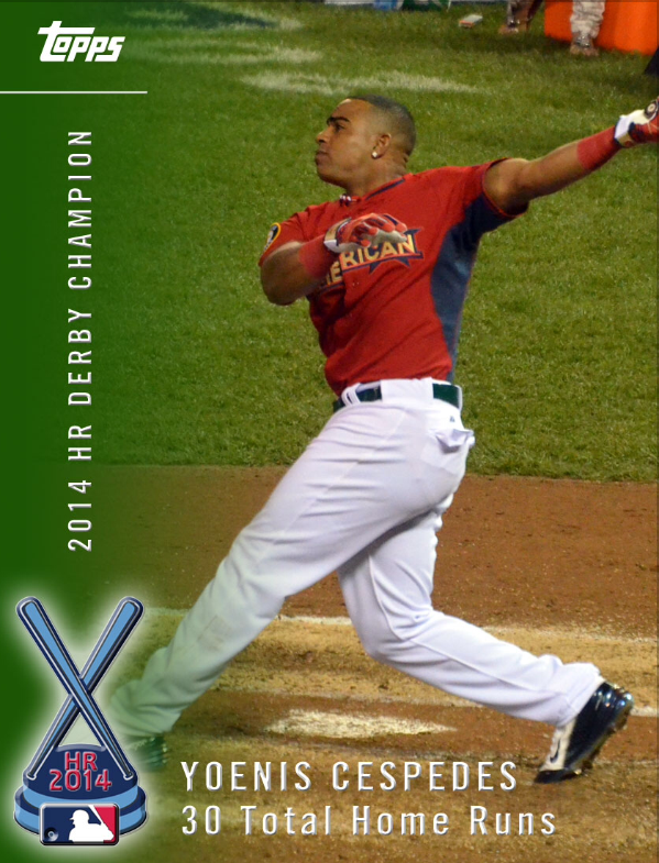 Cool pic for this card, and quite the chase from what I have seen people offering for it. There are 750 copies of it, but I know that a lot of people want it for their collection. Cespedes put on a show for the second time in two years, and came away champ over some tough competition.