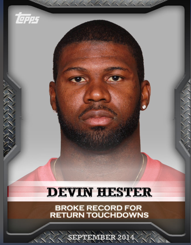At 100 copies, there are close to none of these cards around, and that should be pretty much the driver here. Hester had a great game last night, and this is his only card so far. It will likely be joined by a POTW card, and its likely that card will be nice too. The problem is Hester wont be all that involved in the Falcons offense, and his card will only score on those KO and PR that dont get fair caught or kicked out the back of the endzone. All that being said, this is another example of why the mug shot cards are so bad. Hester looks awfully upset, haha.