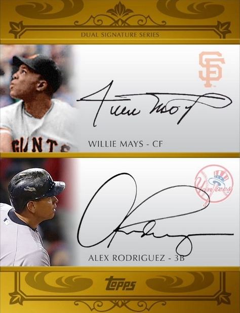 When I saw this released, I was intrigued to say the least. Although Dual Sigs were pretty common last year, released frequently throughout the year, we hadnt seen them yet in 2015. To be honest, I like the 2014 design a lot better, as it gave a lot more space for big photos of the players. Here, the focus is on the sigs. There is a lot of space that I feel could be better used, but that’s just me. Its clear they are modeling these cards off of dual sigs from the physical side of the business, and though its not as cool as 2014, the card is still very nice. A-Rod is a villain and then some, and he has gotten a lot of attention in Bunt lately because of his 661st home run, but this was a cool idea to pair him with Mays. Everyone loves Mays.