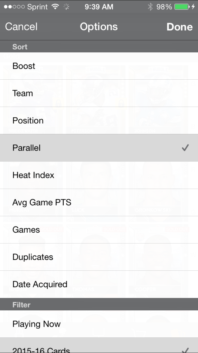 - Playing Now: Will remove all cards from view for players that are not currently on the field. All displayed cards will be actively scoring points.